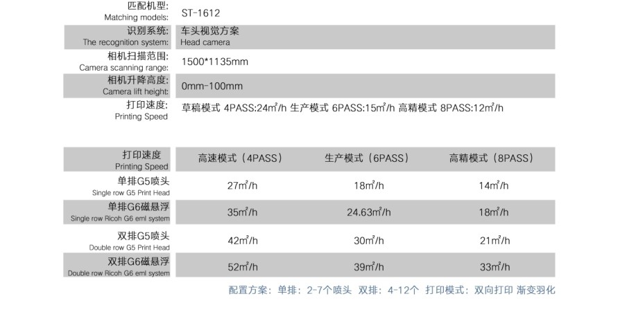 經典款理光G5配置:草稿模式 4PASS:24㎡/h 生產模式6PASS:15㎡/h 高精模式 8PASS:12㎡/h