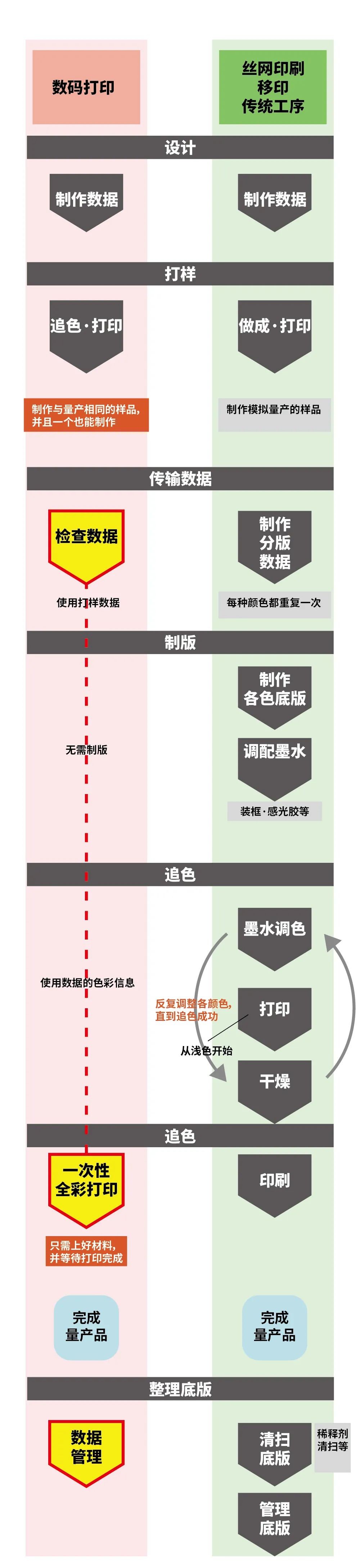 以往的傳統(tǒng)印刷中,需在生產(chǎn)前使用必要分量的墨水來追色,數(shù)碼打印中則不需要。