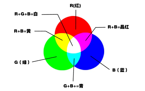 將紅(Red)、綠(Green)、藍(Blue)三原色的色光以不同的比例相加,以產生多種多樣的色光。